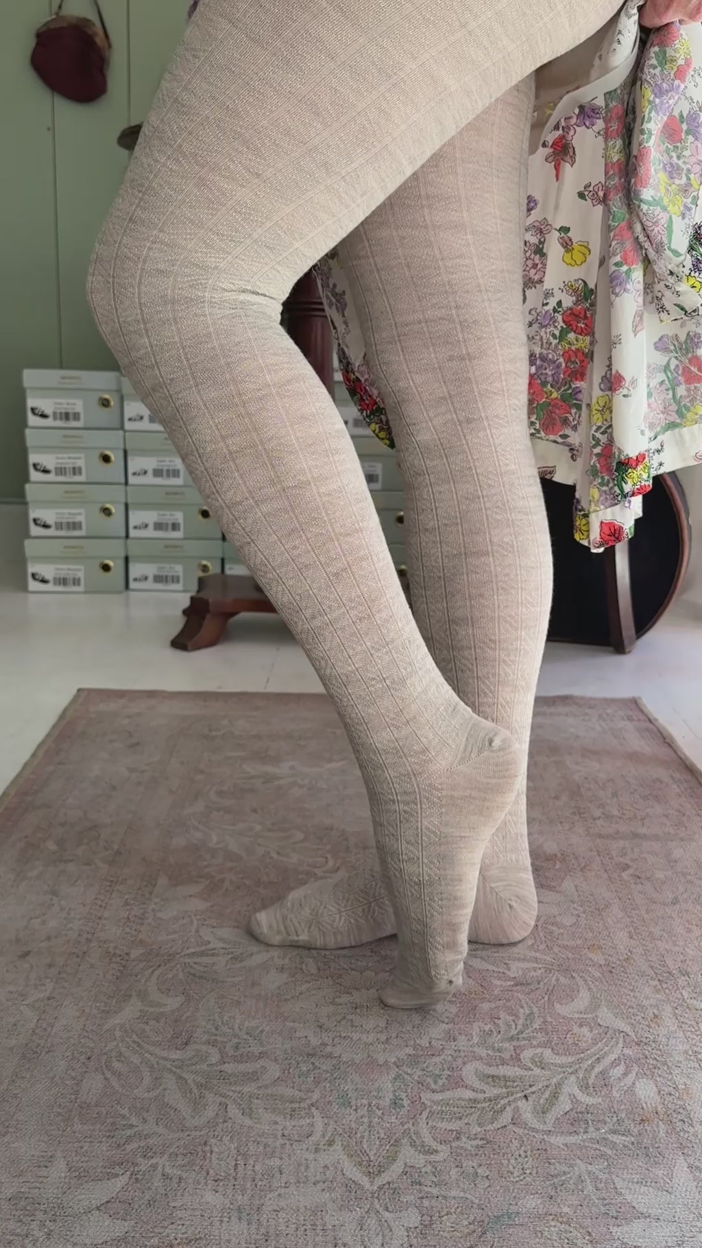 In the 1940s and 1950s, women wore garter stockings, but today most prefer tights. So we’ve designed wool tights with a vintage knit pattern inspired by an original 1940s pair of garter stockings.
