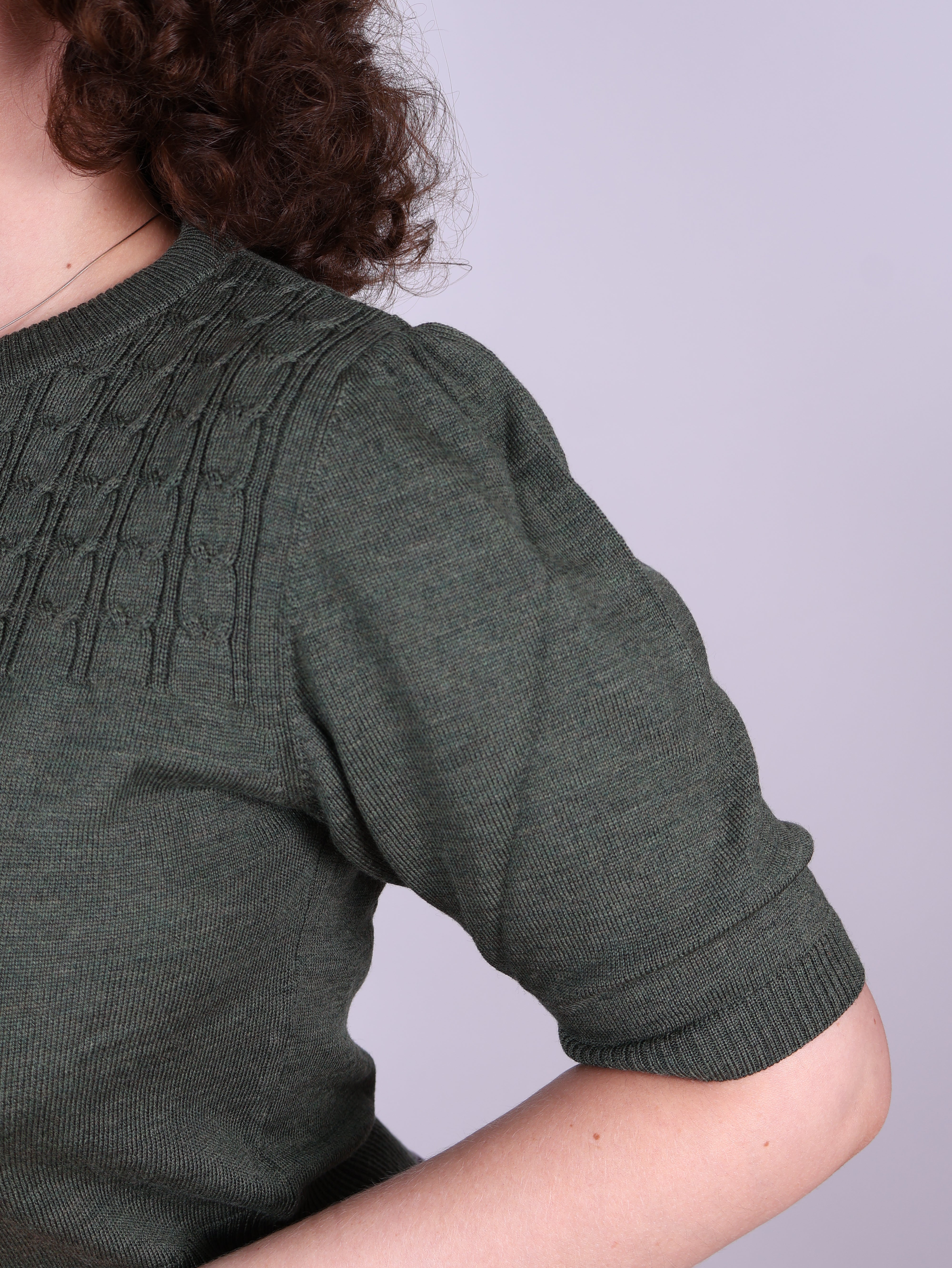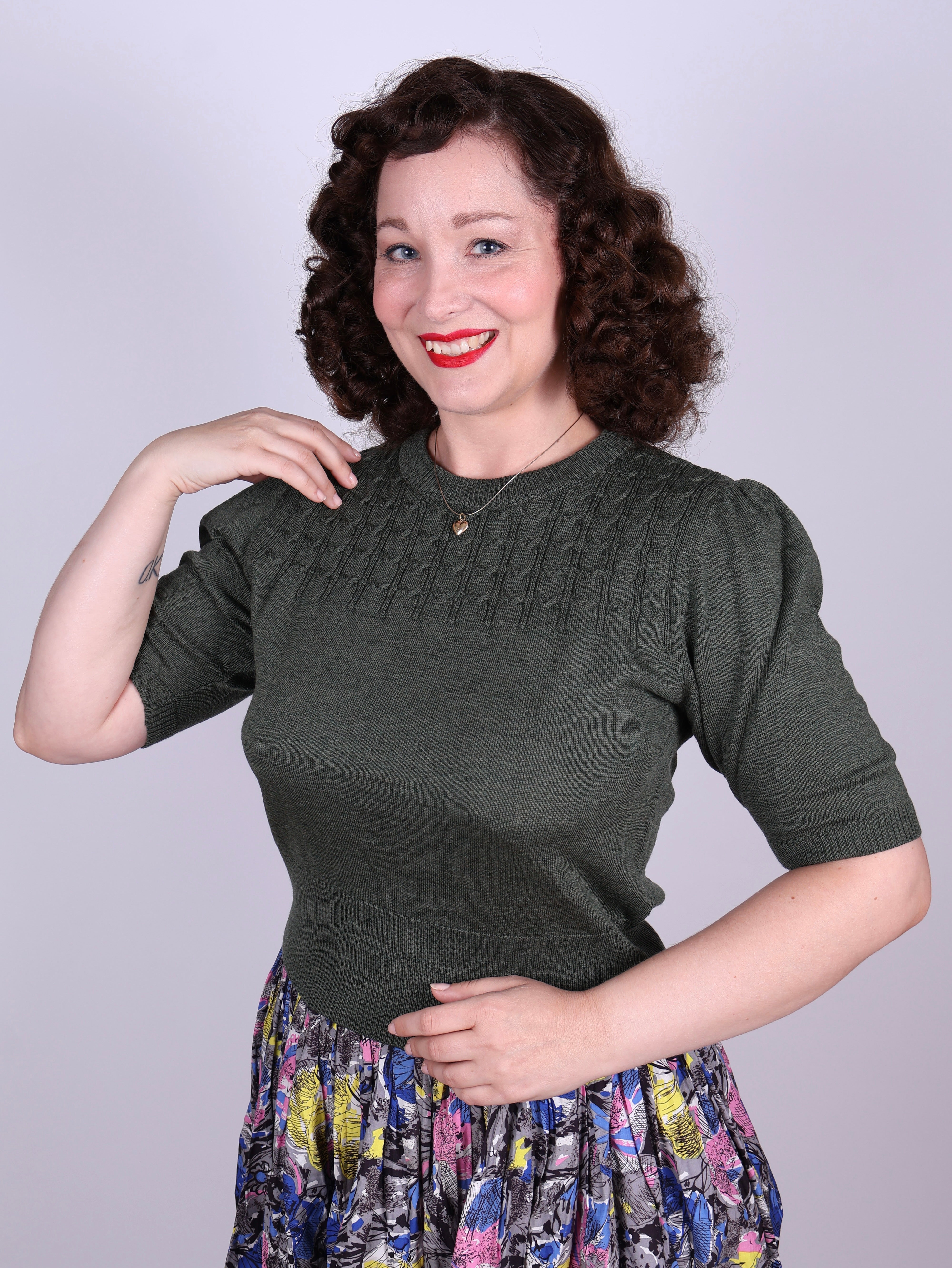 Sally is a 1940s/1950s-inspired short-sleeved pullover with decorative cable knit patterns. It features a round neckline, a fitted waist and bust, and slim-fitting short puff sleeves with ribbed edges.