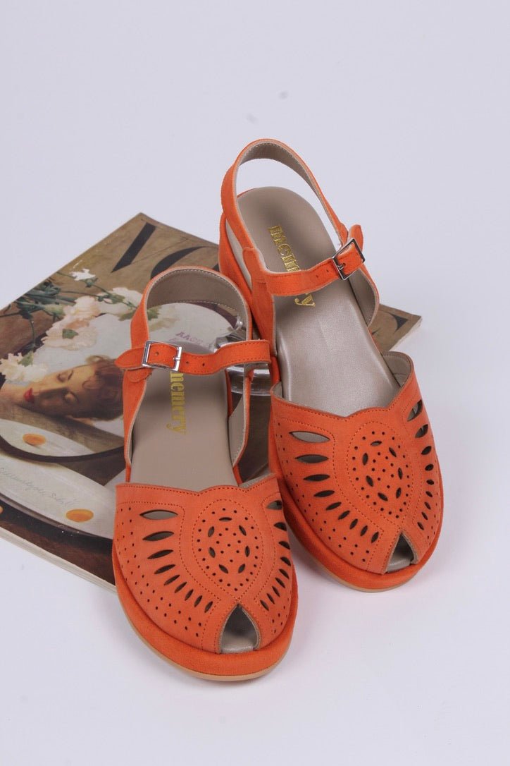 Soft 1940s- and 1950s-inspired summer wedge sandals with cutout pattern and peep-toe.