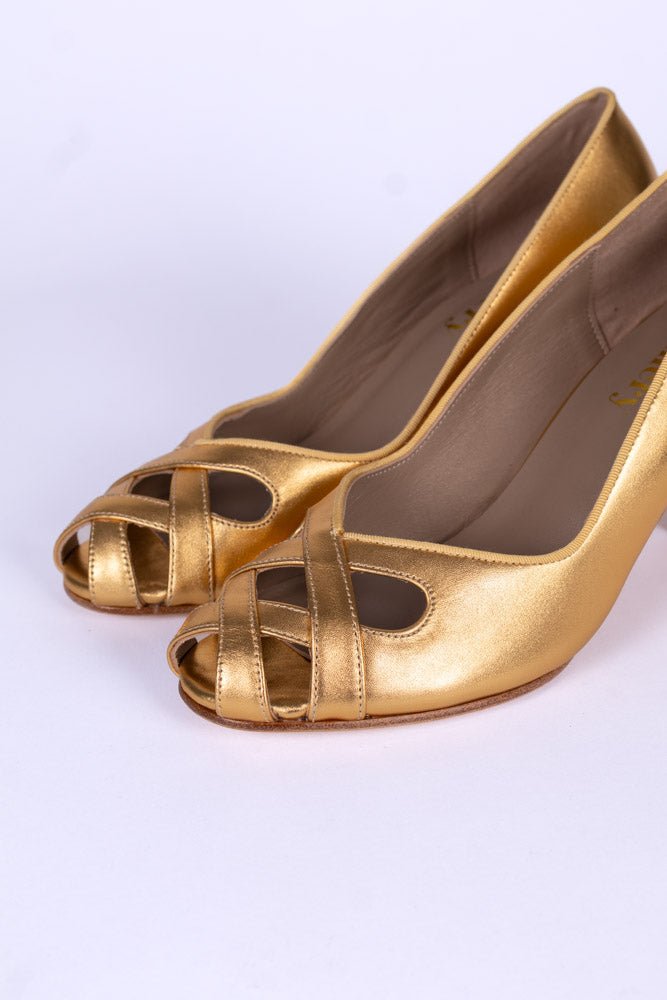 Audrey is a peep-toe court shoe with a high heel, inspired by the late 1940s and early 1950s, featuring an elegant braided pattern.