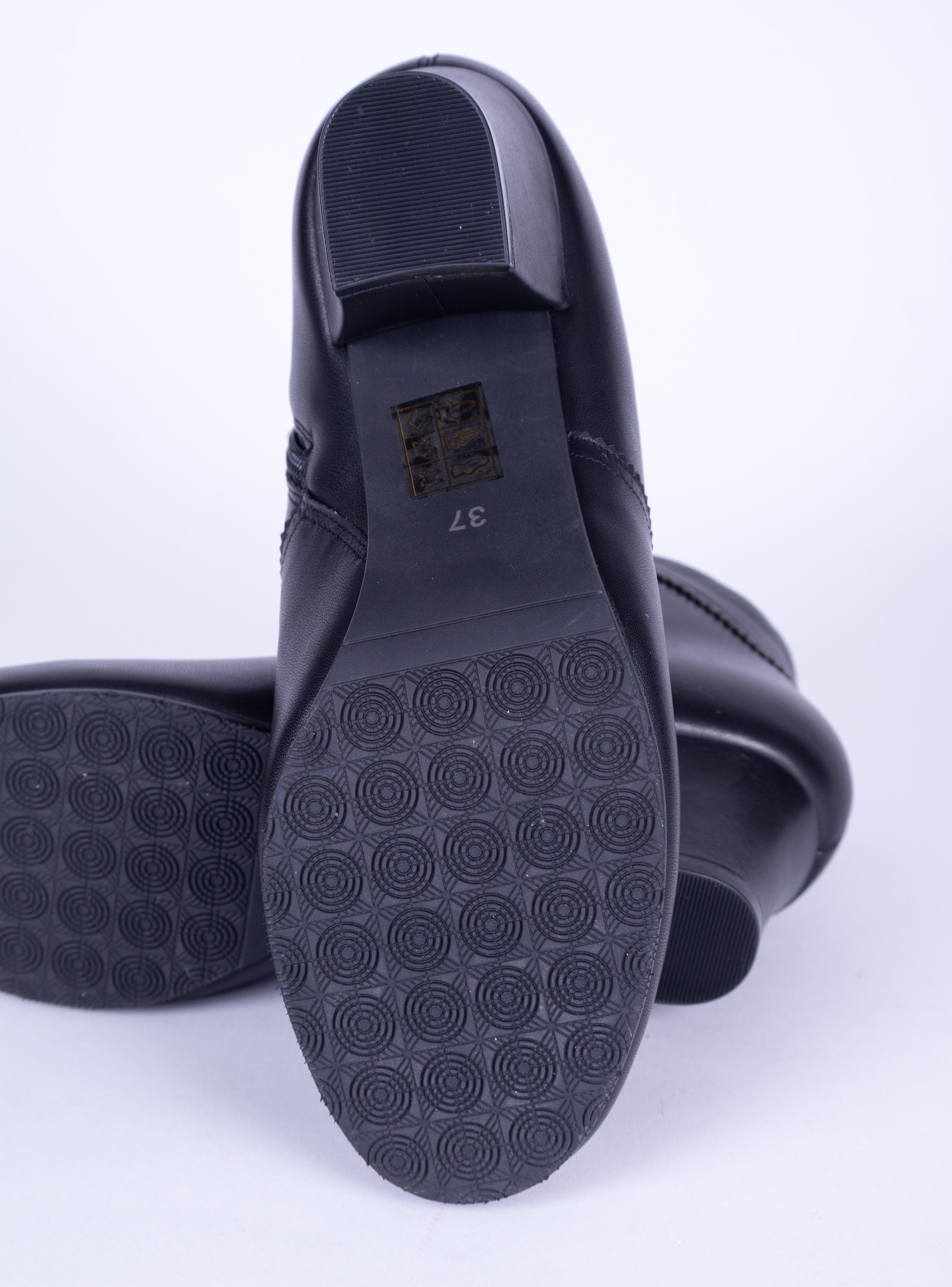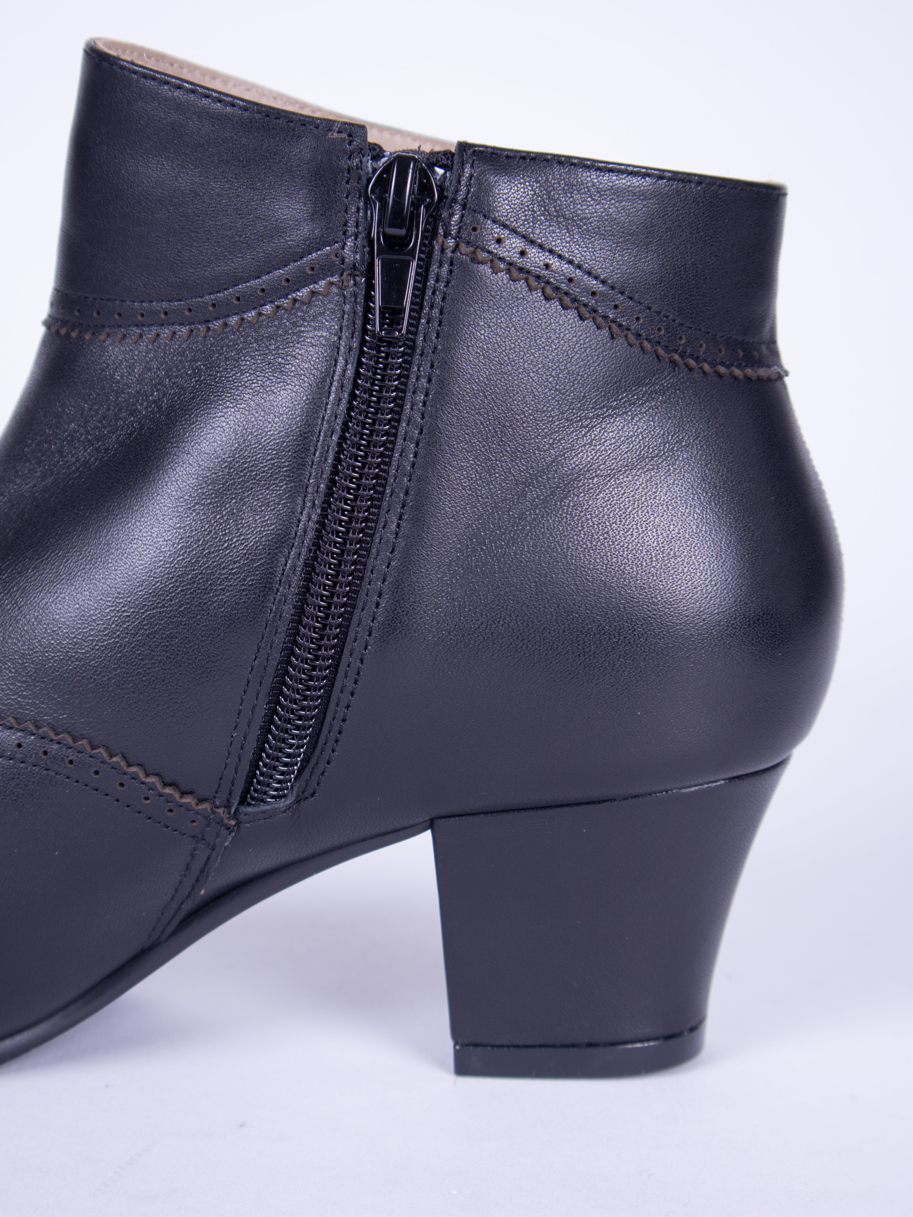 The boot features a rounded, spacious toe cap, decorative brogue detailing, and a slim-fitting short boot shaft. For easy fastening, the boot has a metal zipper on the inner side. The sturdy, slightly curved, medium-high heel and the short, close-fitting shaft give the boots an elegant, sophisticated look.